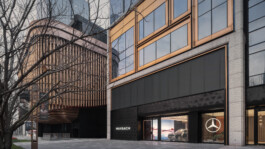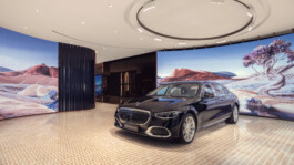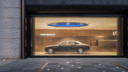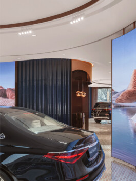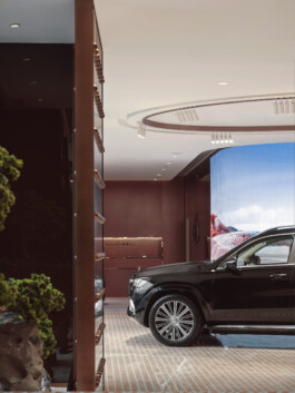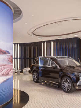 The Maybach Atelier in Shanghai remains the first flagship store of its kind. A space where customers can truly experience the craftsmanship and refined quality that define the brand. Integrated screens subtly break up the physical space, opening up into a digital world that brings lightness and a sense of vastness to the room. This world playfully incorporates Maybach’s brand identity – from rosé gold accents, to the vertical lines of the iconic grille, to mycelium, a sustainable alternative to leather.